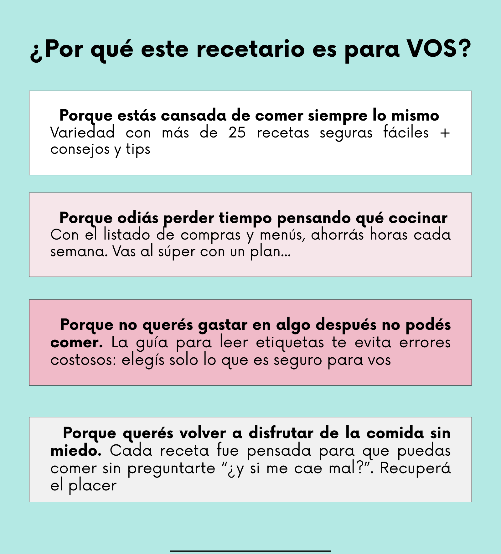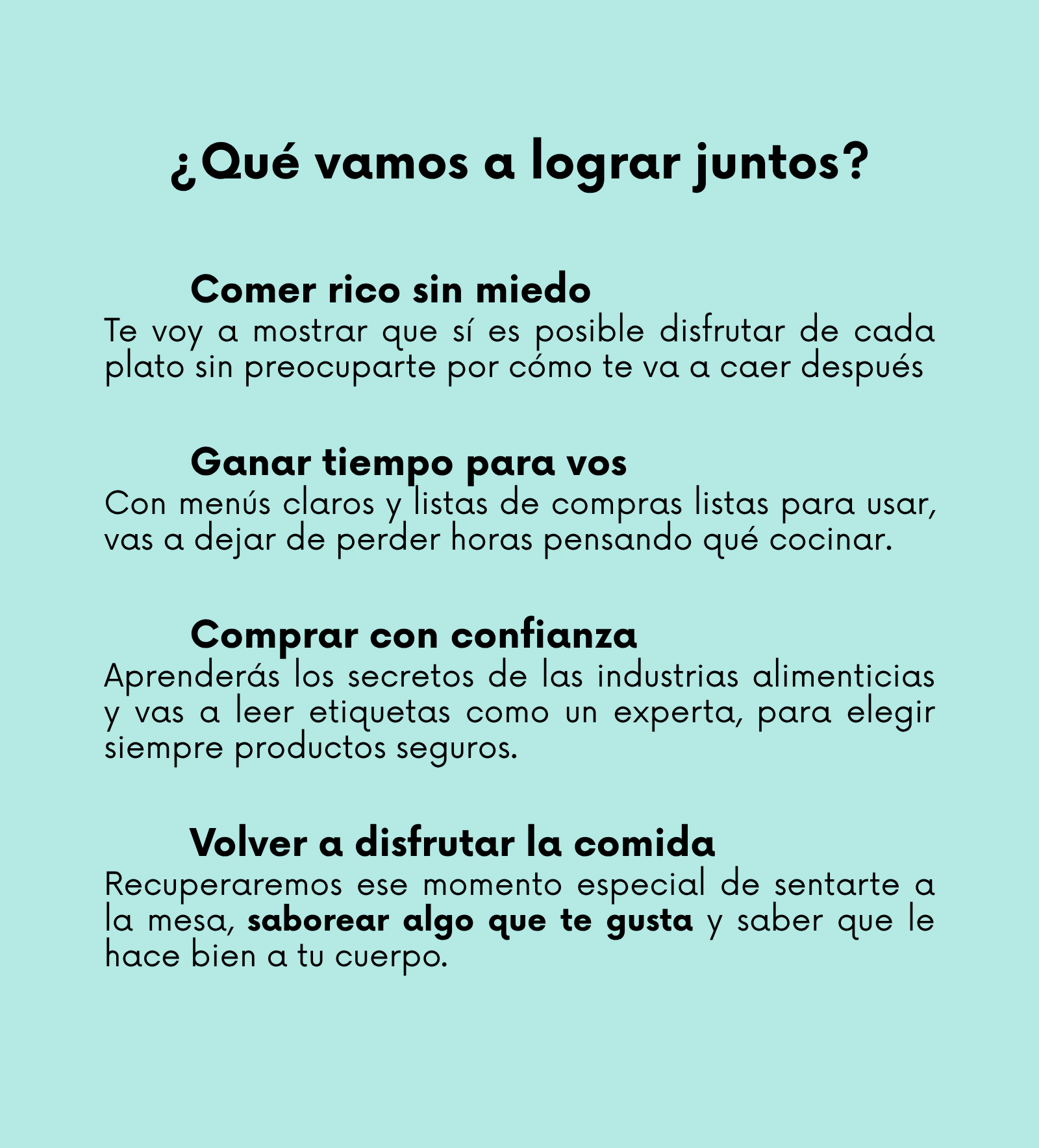 Si sentís que este pack no te ayuda a planificar mejor tus comidas, elegir productos seguros o disfrutar recetas sin miedo a los síntomas, te devolvemos el 100% de tu dinero, sin preguntas.